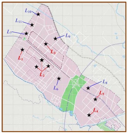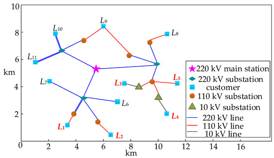 The brief geography diagram is shown in Figure 6, while the internal network model is shown in Figure 7. The internal network model consists of three 220 kV substations, six 110 kV substations and 11 customers. The authors selected five typical sensitive high-tech manufacturers for the empirical analysis.