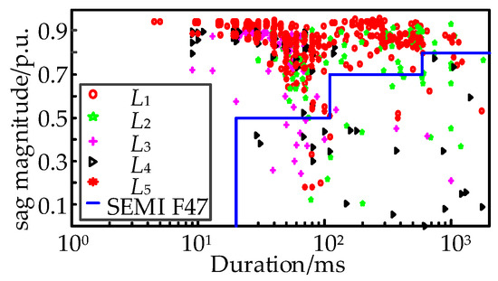 Scatter plot of the measured voltage sags of L1~L5 and the SEMI F47 characteristic.