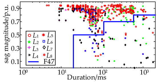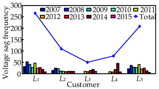 Power quality (PQ) monitoring devices Schneider ION 7650, are installed at each customer’s 10 kV bus connecting point. When voltage sags occur on the 10 kV bus, PQ monitoring devices will record the voltage sag events. The scatter plot of the measured voltage sags on the customer L1~L5 side and the SEMI F47 characteristic is shown in Figure 8. SEMI F47 is a specification for semiconductor processing equipment voltage sag immunity, indicating that sensitive equipment must tolerate voltage sags at a certain range of voltage magnitude and durations. When voltage sag is above the SEMI F47 curve, sensitive equipment can ride through, otherwise the equipment will break down. The voltage sag frequency of the customer L1~L5 from 2007 to 2015 is shown in Figure 9.