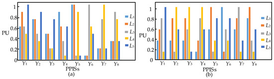 Taking into account the disappointment-rejoicing psychological perceptions of SCs and the NERC towards the two-sided matching results and combining Equations (5)–(8), SCs’ and the NERC’s PU matrix can be obtained, which are also plotted in Figure 10.