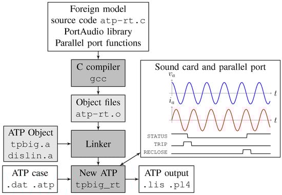 A foreign model was developed to interact with the real world (equipment) according to Figure 1. This component receives the voltage and current values computed by ATP in each simulation step and then converts them into electrical voltage signals through the sound card DAC, whose programming interface in C is provided by the PortAudio library. The sampling rate was set to 10,000 samples per second, which means that ATP must be configured to work with a simulation step of 100 μs. The PortAudio library works with the GNU/Linux sound card driver called ALSA, an acronym representing Advanced Linux Sound Architecture, which is suitable for real-time tasks and displays an overrun message when the value of the variable to be computed is not ready to be externalized to the sound card or when the externalization process is time-consuming and the sampling rate is consequently exceeded. Therefore, it is possible to determine whether a given simulation has run in real time in all simulation time steps. Likewise, the circuit breaker (CB) status is externalized by writing to a parallel port register. A 5 V signal appears in a parallel port pin if the CB is closed; otherwise, the signal is 0 V. This signal is used by the IED auto-reclosing logic. Another register in the parallel port is read in this component, where the relay trip signal is received. This trip signal acts as a control of a switch controlled by MODELS, which simulates the CB.
