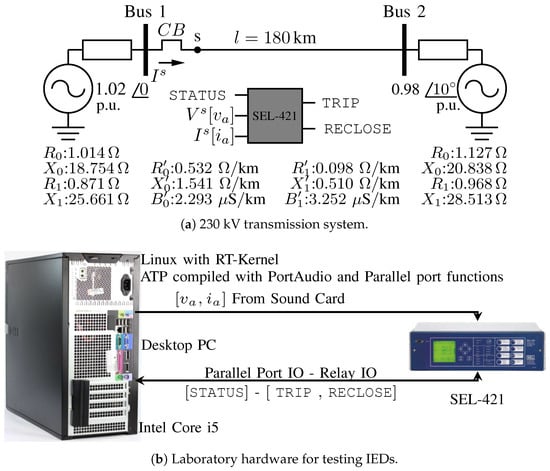 An HiL system was used to analyze the performance of the ATP-RT by testing an SEL-421 relay. As this IED enables signal-level testing, the analog outputs of the sound card are injected directly into the IED without intermediate amplifiers. The CB status bit (STATUS) is sent to the relay through the parallel port, and the relay trip and reclose signals (TRIP and RECLOSE) are also received through the parallel port. A schematic diagram of the hardware connection is shown in Figure 2b. Since only two analog outputs are available, the voltage and current from Bus 1 are injected into the IED. The voltage and current go through conversions of 2000:1 and 2000:5, respectively. The analog outputs are calibrated according to the low signal equivalent of the IED described in [].