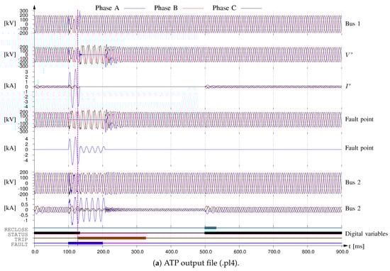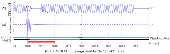 Figure 4b shows the signals recorded by the IED in COMTRADE format [] for this case, namely, the voltage , current , and digital variables (i.e., CB status, trip signal, and reclosing signal). The IED were configured to save 1 s for an event, 10% corresponding to the pre-fault condition. A latency time is observed until the bits of the IED (TRIP and RECLOSE) reach the ATP-RT simulation because these signals are externalized by means of contactors. These signals should reach the parallel port of the PC and be read by the ATP-RT. All real-time simulators have some latency due to the nature of the phenomenon and hardware limitations.