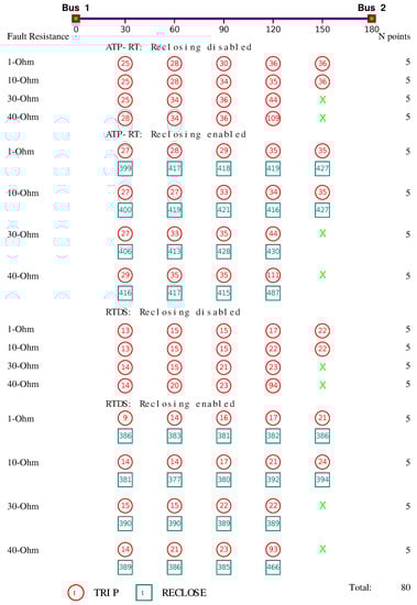 Finally, multiple cases were simulated with different resistances and fault locations; a Python script was written for this purpose. The script generates the specific ATP input file, calls the ATP file (tpbig_rt), analyzes the output file, and saves the operating times of the digital variables for each case. The same cases were simulated with the well-known RTDS, and the operation times were also analyzed. Figure 5 was generated using an automated reporting software for this type of test that includes the asserted bits and their operation times for a set of tests. The upper part shows the results of simulations obtained with the developed ATP-RT, and the lower part shows the results obtained with the RTDS. Circles represent TRIP bits, and squares represent RECLOSE bits. The time (in milliseconds) of the bit operation after the fault start is contained within the symbols. The both cases were considered in the relay setting: auto-reclosing disabled and auto-reclosing enabled. The IED performs similarly when tested by the ATP-RT and RTDS; the little difference between them is due to the fact that the signals coming from the IED reach the RTDS faster than they reach the ATP-RT. These cases are not exactly identical because the fault insertion angle was not considered. However, the RTDS receives the signal faster due to the parallel port acquisition speed. The average difference is 12 ms. Moreover, it is important to quantify the latency of the ATP-RT versus widely accepted real-time simulators.