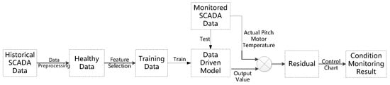 A data-driven approach for the CM of WT pitch systems using SCADA data has been presented. The pitch motor temperature was applied to monitor the condition of pitch systems as the status indicator. Then, a regression model was established to represent the relationship between the pitch-motor temperature and the selected features in the normal operations, including battery-cabinet temperature, hub temperature, ambient temperature, pitch-motor current and pitch blade angle, which were determined based on three feature-selection algorithms. An SVR algorithm was employed to model the pitch-motor temperature and compared with five data-driven algorithms, Ridge, Lasso, kNN, RF, and ANN. As a result, SVR was determined to construct the data-driven model because of its excellent generalization ability. It was found there is little difference between the model output and the measured value in the normal operations, and the residual errors are normally distributed. Therefore, the abnormal monitored temperature indicates a potential pitch-system fault. With the moving-average approach and the EWMA control chart, the abnormal condition could be identified clearly once there are five residual-based statistics exceed the control limits. The results demonstrate that pitch-system failures are successfully detected earlier than the SCADA alarm system with the proposed approach. Moreover, it is more effective and applicable than the classification models.