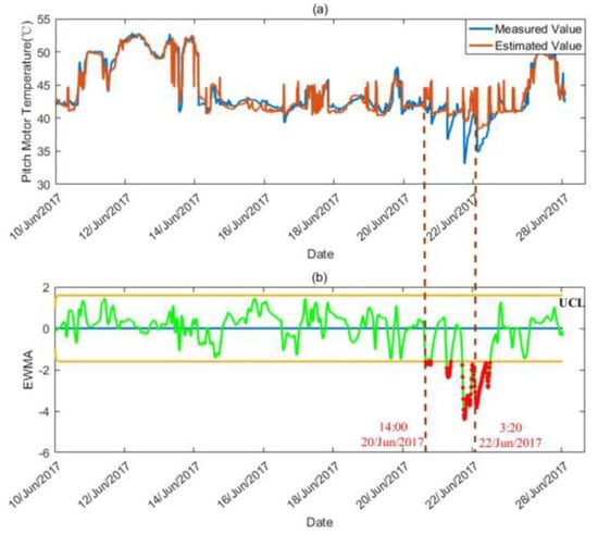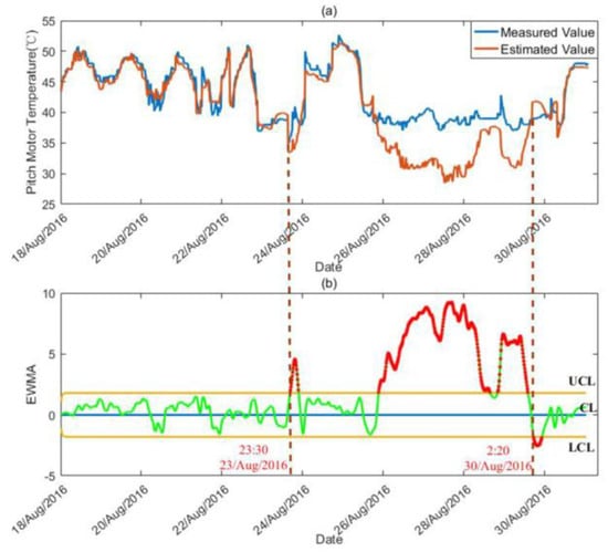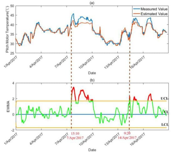 28]. In this paper, an EWMA-based residual analysis method is adopted for the CM of WT pitch system. The outliers of the EWMA control chart that exceed the control limits are viewed as out of control, which could indicate impending pitch-system failure.