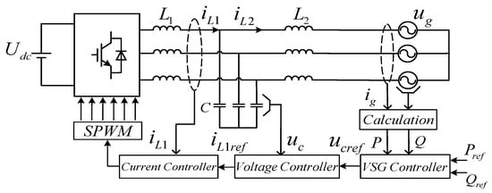 The schematic of a VSG with voltage and current loops is shown in Figure 1. The outer loop is the VSG control scheme, and the inner loops are the voltage control and current control, respectively.