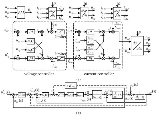 Schematic diagram and model of the control part: (a) Schematic diagram of the voltage and current controllers; (b) Control block diagram of the voltage and current loops in d-axis.