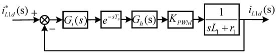 The schematic diagram of the voltage and current controllers is depicted in Figure 2a. The control block diagram of the voltage and current loops in dq reference frame is depicted in Figure 2b. Considering the cross-decoupling of the capacitor voltage and the inductance current, the cross-coupling between the d-axis and q-axis can be approximately eliminated, so Figure 2b only shows the control block diagram in the d-axis. Gv(s) and Gi(s) are the transfer functions of the voltage controller and the current controller, respectively; e−sTs is used to represent the calculation delay; Gh(s) is the transfer function of zero-order holder, which is used to represent the modulation delay, and in this paper it can be expressed as e−0.5 sTs. Kpwm is the gain of the switching circuit. The switching frequency of the inverter is 10 kHz, and asymmetric regular sampling method is used in the pulse-width modulation (PWM), so the sampling period Ts is equal to 50 μs. In order to improve the response speed of the system, the feedforward of capacitor voltage and grid current is used in the control block diagram, indicated by dotted lines in Figure 2b. The parameters of the system are listed in Table 1.