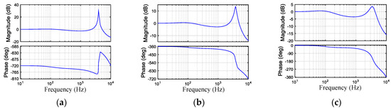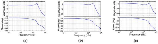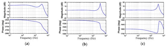 Bode diagrams of voltage closed-loop transfer function: (a) fz = 250 Hz; (b) fz = 550 Hz; (c) fz = 750 Hz.