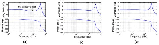 If we set the several parameters as τ = 3Ts, rc = 5Ω, Kvp = 0.5 and select fz as 250 Hz, 550 Hz and 750 Hz, respectively, then the Bode diagrams of voltage closed-loop transfer function are as depicted in Figure 14. It can be seen that increasing fz can increase the minimum of the concave part in amplitude-frequency curve, but cannot suppress the resonance peak. If the minimum of the concave part is large enough, the bandwidth of the voltage loop is also wide, so increasing fz can widen the bandwidth of the voltage loop.