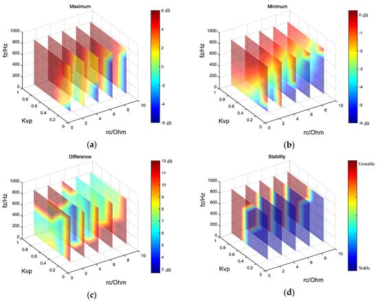 According to the analysis in Section 3, if τ is larger than 3Ts, the resonance peak in the current closed-loop transfer function can be suppressed completely, but if τ is too large, the bandwidth of the current loop is narrow, so the value of τ is selected as 3Ts. As analyzed before, increasing rc can suppress the resonance peak in amplitude-frequency curve, but if rc is too large, the power dissipation of damping resistances also obviously increases, so the value of damping resistance rc is usually smaller than 10 Ω in engineering practice. When rc = 1 Ω and τ = 3Ts, in order to keep the system stable, the proportion coefficient Kvp should smaller than 0.63 according to root locus, so we make the range of Kvp from 0 to 1 firstly. In a continuous control system, fz is selected between 100 Hz and 200 Hz, but a discrete control system is different from a continuous control system. It is shown in Figure 14 that increasing fz can increase the minimum of the concave part in amplitude-frequency curve, which can widen the bandwidth of the voltage loop to realize the purposes of the optimum parameter design, so fz is selected between 100 Hz and 1000 Hz. Among the range of rc, Kvp and fz, we select five datapoints, respectively, so 125 sets of parameters can be used to calculate the properties of the system. The results of this numerical calculation are depicted in Figure 15 in the form of a slice figure, in which different colors are used to represent different values of the properties.