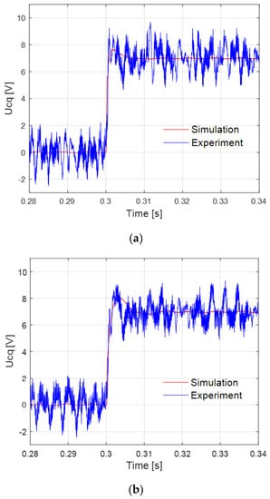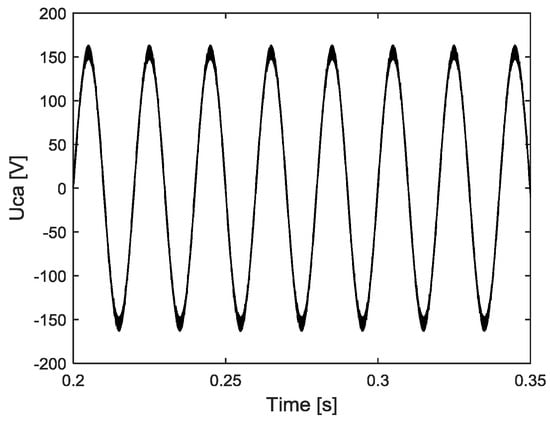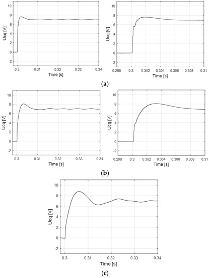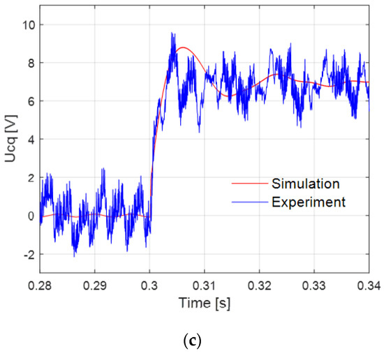 The parameter design is analyzed in detail in Section 4, and the same three sets of parameter of rc, Kvp and fz are selected to verify the mathematical model and the parameter design. The reference value of capacitor voltage ucq is 0 V initially. When the time is 0.3 s, the reference value of ucq is changed to 7 V. The reference value of ucd is 155.6 V, which is equal to the grid voltage ugd (155.6 V). The grid voltage ugq is equal to 0 V. The simulated results are shown in Figure 22 and Figure 23. The waveform of capacitor voltage uca with set 1 is depicted in Figure 22, which implies that the system is stable with this set of parameters. Figure 23 depicts the step response of capacitor voltage ucq, and they are consistent with that shown in Figure 17, Figure 19 and Figure 21, respectively, during the transient process, which implies that the mathematical model of the voltage loop is correct. Figure 23a shows that the system can respond to the reference value rapidly with set 1, and the overshoot is small, which indicates that the parameter optimum design is effective.