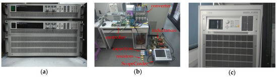 The experimental test bed: (a) DC voltage source; (b) main circuit, controller and ScopeCorder; (c) grid simulator.