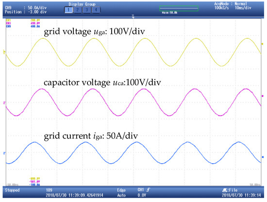 The reference value of capacitor voltage ucq is 0 V initially, and the step reference is 7 V. The reference value of ucd is 77.78 V, which is equal to the grid voltage ugd (77.78 V). The grid voltage ugq is equal to 0 V. The experiment results are shown in Figure 25 and Figure 26. The waveforms of grid voltage uga, capacitor voltage uca and grid current iga with set 1 are depicted in Figure 25, which implies that the system can work stably with this set of parameters, when ucq is 7 V and ucd is 77.78 V. The step response of capacitor voltage ucq from 0 V to 7 V with different control parameters are shown in Figure 26. It can be seen that the experiment results are consistent with the simulation results during the transient process, which indicates that the proposed parameter design strategy is correct and useful. Due to the capacitor voltage distortion, it can be observed that there are ripples, which cause the difference between simulation and experiment results, in capacitor voltage ucq.