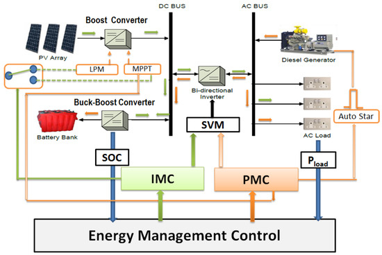 - Belila, A.; Tabbache, B.; Berkouk, E.M.; Benbouzid, M.E.H. Integration of a storage system in a hybrid system ‘Diesel-Photovoltaic’ for stand-alone applications. In Proceedings of the 2017 IEEE EEEIC, Milan, Italy, 6–9 June 2017; pp. 1–6. [Google Scholar]