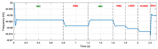- At 2.2 s, the SOC drops below 10%. All the loads are disconnected and the system is in the disconnection (DISC) mode.