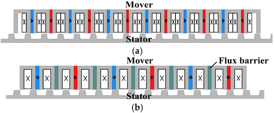 The mover structures of 12/14 LFSPM-SK2 and 12/14 LFSPM-ISK2 machines are given in Figure 3d,e, for example, and while not shown, the 12/14 LFSPM-SK3, MLFSPM-SK3, MLFSPM-SK2 machines have similar mover structures with 12/14 LFSPM-SK2 machine, and MLFSPM-ISK2 machine has similar mover structure with 12/14 LFSPM-ISK2 machine. For the LFSPM machines with improved two-step skewed stator, as seen in Figure 3e, in order to reduce the cogging force and at the same time, to suppress the harmonics in PM flux-linkage, the mover is divided into two parts of same size, with a flux barrier at a depth of 5 mm between them, and the flux barrier is used to avoid a magnetic short circuit between the two mover parts. A front mover pole and a back mover pole with opposite magnetized magnets constitute one complete mover pole by sharing one armature coil. Correspondingly, a flux barrier is placed between the two step stator parts, as seen in Figure 3c [20,21].