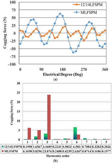 where Fmi and φci are the fundamental magnitude and phase angle of the ith harmonic component, respectively, x is the mover position, and τs is the stator pitch. The cogging forces of the two machines are shown in Figure 2a. It can be seen in Figure 2a, both machines are found to exhibit large cogging force, especially for the MLFSPM machine, the cogging force is too big for further application. Figure 2b shows the harmonic distribution of the cogging forces. Obviously, for both machine, the components over the seventh order are very small, and for the 12/14 LFSPM machine, the components of second, third and sixth are relatively large, while for the MLFSPM machine, the components of fundamental, second, third and sixth are relatively large.