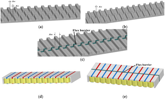 As previously analyzed, both the 12/14 LFSPM machine and the MLFSPM machine exhibit big cogging force due to the double salient structure, which is the main component of the thrust force ripple. As one of the rotor skewing methods, the rotor step skewed technique can effectively reduce the cogging toruqe of rotary machines, and this technique can be also used for the cogging force reduction of linear machines, namely, stator step skewed structure. Therefore, for both LFSPM machines, three stator step skewed structures are employed for comparison, which are three-step skewed stator (SK3), two-step skewed stator (SK2) and an improved two-step skewed stator (ISK2), as shown in Figure 3a–c, respectively. As can be seen, the stators of SK3 and SK2 are arranged axially in three and two steps, respectively, while the stator of ISK2 is arranged axially in two steps with a flux barrier sandwiched between them. Next, two LFSPM machines with the above step-skewed sator structures are proposed and compared, the names of which are listed in Table 2.