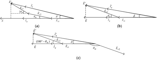 Figure 4 gives the vector diagrams of the LFSPM machine with and without step skewed stator, respectively. Here, θsk is electrical angle of xsk, and are vectors of the phase no-load back-EMF without and with step skewed stator, respectively, and δ is the angle between and , and are vectors of the q-axis current without and with step skewed stator, respectively, is the vector of the phase no-load back-EMF corresponding to the kth skewed stator step, and , where Esk and E are the magnitude of and , respectively, has the same phase angle with that of . In Figure 4a, , and in Figure 4b, . In Figure 4c, due to the magnets of the two mover parts of the LFSPM machine with improved two-step skewed stator are oppositely magnetized, .