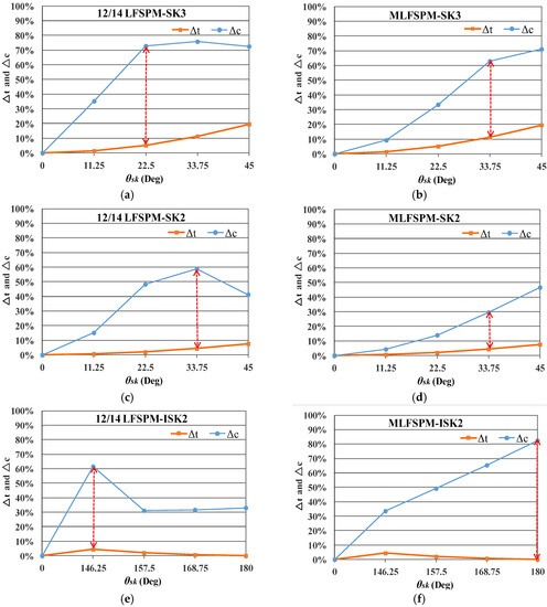 The variation of Δt and Δc with different θsk for: (a) 12/14 LFSPM-SK3 machine; (b) MLFSPM-SK3 machine; (c) 12/14 LFSPM-SK2machine; (d) MLFSPM-SK2 machine; (e) 12/14LFSPM-ISK2 machine; (f) MLFSPM-ISK2 machine.