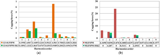 The harmonic distribution comparison of cogging force for: (a) 12/14 LFSPM machines; (b) MLFSPM machines.