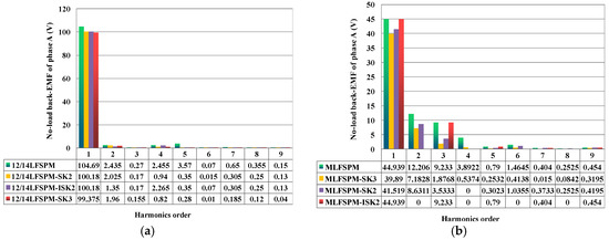 The harmonic distribution of the no-load back-EMFs for: (a) 12/14 LFSPM machines; (b) MLFSPM machines.