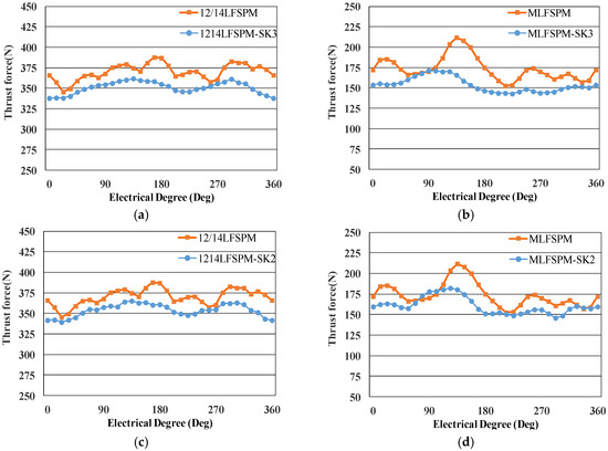 Therefore, the thrust force of the LFSPM machines under selected θsk are shown in Figure 8 under 2D FEA, and σ, which is defined as the proportion of the p-p thrust force ripple to the average thrust force, is listed in Table 3. It can be found that, owing to the cogging force reduction and back-EMF harmonic suppression that based on the stator step skewed structures, the thrust force ripple of the original LFSPM machines are reduced greatly, especially for the 12/14 LFSPM-SK2 machine and the MLFSPM-ISK2 machine, the p-p thrust force ripples have been suppressed to 6.6% and 14% of the average thrust force, in addition to the decrease of the average thrust force by 4% and 0%, respectively. For comparison, σ under 3D FEA is also listed in Table 3, it shows that the 3D FEA results are generally higher than the 2D FEA ones.