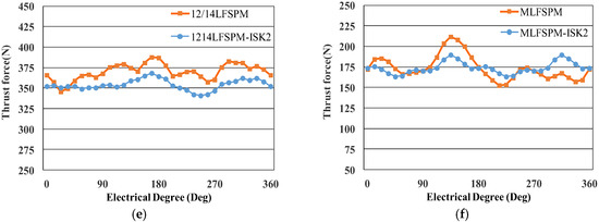 The thrust force comparison for: (a) 12/14 LFSPM-SK3 machine; (b) MLFSPM-SK3 machine; (c) 12/14 LFSPM-SK2machine; (d) MLFSPM-SK2 machine; (e) 12/14LFSPM-ISK2 machine; (f) MLFSPM-ISK2 machine.