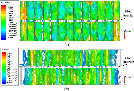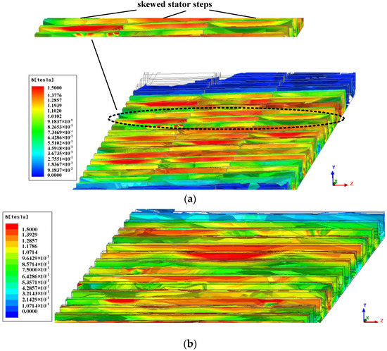 Due to the studied machines having a 3D structure, the 3D FEA is performed to analyze the magnetic independence, taking 12/14 LFSPM-ISK2 and 12/14 LFSPM-SK3 machines as examples. Figure 9a,b give the open-circuit flux density of the mover and the stator of the 12/14 LFSPM-ISK2 machine (top view) under 3D FEA, respectively. As can be seen, the employment of flux barriers isolate the magnetic circuits of the two mover parts and the two stator steps, indicating the two step skewed stator of 12/14 LFSPM-ISK2 machine has good mutual magnetic independence.