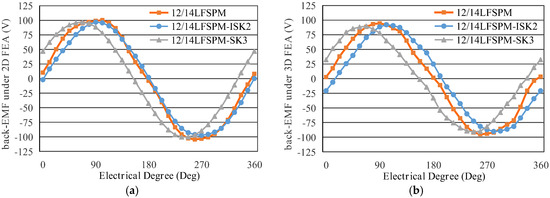 Figure 11 shows the phase A no-load back-EMF for the 12/14 LFSPM, 12/14 LFSPM-ISK2 and 12/14 LFSPM-SK3 under 2D FEA and 3D FEA, respectively. It is worth noting that the magnitude of the no-load back-EMF of 3D FEA is a little smaller than that of 2D FEA. It can be found that the results are in good agreement under 2D FEA and 3D FEA.