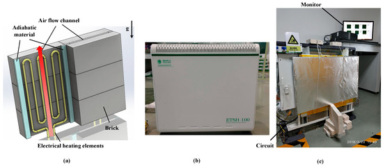 The present ETS device consists of two electrical heating elements and twelve bricks. As shown in Figure 1a, these bricks are stacked into two parallel rows and each row has a height of three bricks and a length of two bricks. By adding adiabatic material, the gap between those two rows is divided into two independent channels where electrical heating elements are inserted. Except for the inlet and outlet of the flow channels, these bricks are wrapped by rock wool as the adiabatic material, which is not shown in Figure 1a. Figure 1b shows the appearance of the whole ETS device, which is enveloped in a metal casing. Figure 1c shows the configuration of the tested ETS device where the auxiliary circuit is set at the left side and the metal casing is removed.