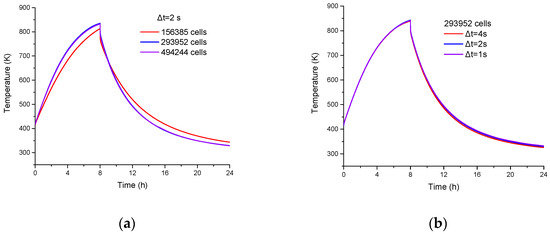 The finite volume method is used to discrete the computational domain. The diffusion and convection terms in the above governing equations are discretized with second order accuracy. The unsteady term is solved by fully implicit scheme. The SIMPLE algorithm is used for the pressure-velocity coupling. Due to the view factor between any two faces is dependent on the discretized geometry, it can be pre-calculated using the ray-tracing model in ANSYS FLUENT (v15) [20]. The convergence criteria of the continuity, velocity and energy equations are 10−3, 10−3 and 10−6, respectively. Three grids (156,358, 293,952 and 494,244 cells) with different time steps (4, 2 and 1 s) are used to check the grid and time step independences. As shown in Figure 2, the difference of the air temperature at the outlet between the grids of 293,952 and 156,358 cells and between the grids of 494,244 and 293,952 cells are less than 6% and 1%, respectively. With the grid of 293,952 cells, the difference of the air temperature at the outlet among those three time steps are smaller than 1%. Thus, it is concluded that the grid of 293,952 cells with the time step of 2 s is in the convergence region and is used for the following study.