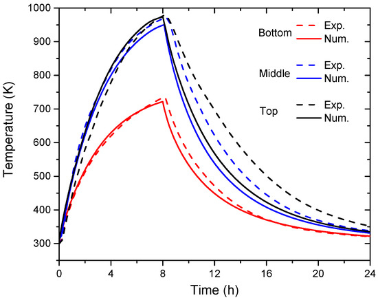 The evolution of the brick temperatures at the bottom, middle and top points of the experimental (Exp.) and numerical (Num.) results.