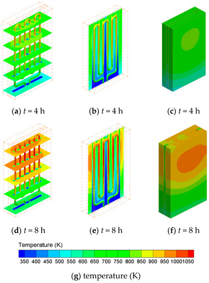 Figure 5 presents the temperature contours of the cross-sections of the bricks with different heights (Figure 5a,d), the middle cross-section of the flow channel (Figure 5a,e), the surface of the electrical heating element (Figure 5a,b,d,e) and the outer surfaces of the bricks (Figure 5c,f) at different charging time (t = 4 and 8 h). It can be seen the electrical heating element has the highest temperature. The top part of the device has higher temperatures than that of the bottom part during the charging process. However, the highest temperature of the bricks does not occur at the outlet, which is because the heating element does not extend to the outlet and thus has little irradiation on the brick surface near the outlet. At t = 4 h, the average temperatures of the heating element surface, all the bricks and the outer surfaces of the bricks are 862 K, 728 K and 655 K, respectively; while they increase to 956 K, 863 K and 774 K, respectively, at t = 8 h. It can be seen that the temperature difference between the heating element decreases from 134 K to 93 K. At t = 8 h, the highest and lowest temperatures of the bricks are 1002 K and 595 K, respectively. Thus, the temperature difference of the bricks is as high as 407 K. After 8 h charging, the average temperature of all the bricks of the proposed ETS device is close to that of the ETS device with PCM presented in Ref. [18] (863 K), while the outlet air temperature of the present ETS device (840 K) is much higher than that of the ETS device with PCM presented in Ref. [18] (560 K). Thus, the proposed ETS device can provide a higher air temperature at the outlet.