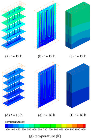 Eight hours later, the electrical heating element is powered off. Due to the thermal energy stored in the bricks, the temperature in the flow channel is still much higher than the ambient temperature and thus the natural convection still exists. The hot bricks discharge their thermal energy to the continuously flowing air. Figure 7 presents the temperature contours of the cross-section of the bricks with different heights (Figure 7a,d), the middle cross-section of the flow channel (Figure 7b,e), the surface of the electrical heating element (Figure 7a,b,d,e) and the outer surfaces of the bricks (Figure 7c,f) at different discharging time (t = 12 h and 16 h). Different from the charging process, the temperature of the bricks gradually increases from bottom to top and the highest temperature occurs at the outer surface of the bricks in the discharging process. At t = 12 h, the average temperatures of all the bricks and the outer surfaces of the bricks are 415 K and 498 K, respectively; while they decrease to 356 K and 392 K at t = 16 h, respectively.