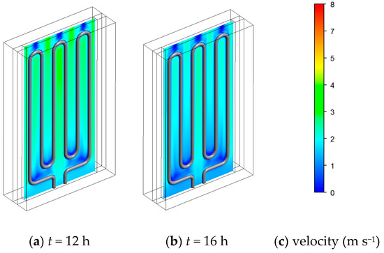 Figure 6 presents the velocity contours at the middle cross-section of the flow channel at different charging time. It can be seen that the air velocity increases from bottom to top in the flow channel which can be attributed to the increased air temperature as shown in Figure 5b,e. The highest velocity rises from 6.8 to 7.7 m s−1 when the charging time increases from 4 to 8 h.