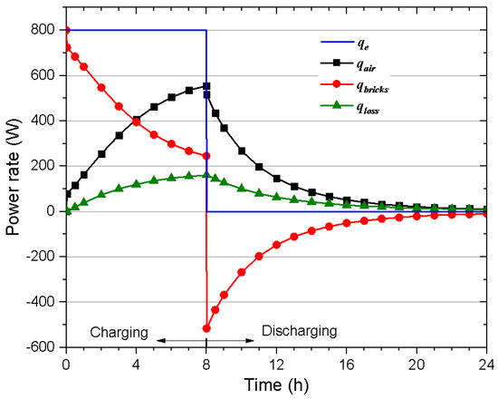 The changes of the electrical power qe, the heat flow transferred to air qair, stored by the bricks qbricks and the heat losses to the ambient through the adiabatic material qloss during the charging and discharging processes.