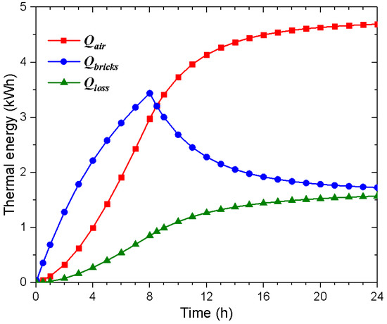 The total energy transferred to the air Qair, stored by the bricks Qbricks and lost to the space Qloss during the charging and discharging processes.