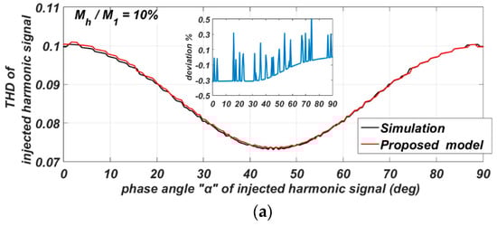 In order to verify the accuracy of the proposed model, the Total Harmonic Distortion (THD) of a 75 Hz harmonic modulation signal has been calculated for two Mh/M1 values, i.e., 0.1 and 0.4, using the above formulas. Following, the obtained results are compared (see Figure 5) against theoretical ones (obtained through MATLAB (v2015b, MathWorks, Natick, MA, USA), validating the theoretical calculations.