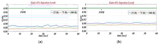 According to Figure 8a–c the Gain at 25 and 75 Hz is affected by the sub/inter-harmonic injection but not significantly, since the distortion is negligible for the low injection levels, as the ones in the experimental test are. Therefore, the Gain at sub/inter-harmonic component with ratios Mh/M1 < 20% is in close match with FOM Gain, consisting them compatible with the Pdc-MICs. It should be noted that Mh/M1 ratios as high as 20% is higher than the usual injection levels, recommended for anti-islanding schemes in grid-connected PV-inverters (power quality requirements). Moreover, it should be mentioned that according to simulations and theoretical analysis the Gain at the sub/inter-harmonics should have been lower for the higher levels of injections, which does not apply in these experimental results. This is due to the fact that the Discrete Fourier Transformation (DFT), which was used to obtain the amplitude of the injected sub/inter-harmonic, has low accuracy for such small injection levels [4,6].