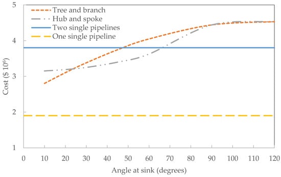 After ascertaining the flow rate of CO2, it may be necessary to decide whether to design a trunk line or “point-to-point” pipelines where more than one CO2 source exist in close proximity. A trunk pipeline also called a backbone or oversized pipeline connects two or more pipelines from CO2 sources to a single sink or multiple sinks while point-to-point (PTP) direct pipelines connect single CO2 sources to single sink(s). The decision to construct a trunk pipeline or single PTP pipelines is purely economic. Knoope et al. [54] and the Intergovernmental Energy Agency for Greenhouse Gas Research and Development Programme IEA GHG [55] concluded that a point-to-point connection is more cost effective if two sources are 100 km from a sink and the angle made by imaginary straight lines joining the two sources to the single sink is greater than 60°. Three scenarios (“point-to-point”, “tree and branches” and “hub and spoke”) of two sources and one sink, with varying angles made by straight lines joining the two sources to the sink from 0° to 120°. The cost of the pipeline was modelled at $50,000 per km per inch and the annual OPEX was assumed at 5% of CAPEX. It was concluded from the analysis that for angles greater than 90°, no cost saving was achieved by the use of a trunk pipeline. For angles between 30° and 60°, the “radial hub and spoke” scenario appeared to be the optimum option and below 15°, the “tree and branches” scenario gave the lowest cost. Table 2 shows the lengths of the three pipelines when varying the angles that straight lines from the two sources make at the single sink between 10° and 120°. The distance of each of the two sources from the sink is held constant at 100 km. The length of the trunk pipeline decreases for the “tree and branch” arrangement but increases for the hub and spoke arrangement as the angle made by straight lines drawn from the two sources to the sink increases. A single trunk pipeline is considered only where the two sources occur at close proximity with negligible distance between them, assumed to form 0 degrees at the sink. Figure 2 shows the capital cost profile of the three pipeline scenarios (two single pipelines, (A and B), and one trunk pipeline), assuming $50,000 per km per inch. The “hub and spoke” arrangement becomes a “tree and branch” arrange for angles greater than 90° because the three pipelines can no longer have equal lengths. Between 24° and 90°, the “hub and spoke” arrangement is more cost effective than the “tree and branch” arrangement. Greater than 47° for the “tree and branch” and greater than 67° for the “hub and spoke” arrangements, the single pipelines are cheaper, respectively. Below 24° the “tree and branch” arrangement is cheaper than the “hub and spoke” arrangement.