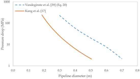 Chandel et al. [27] based the determination of CO2 pipeline diameter on inlet and outlet pressures and length of pipeline. Pipelines were assumed to be buried 1 m below the surface with a constant density and constant temperature of 27 °C. The input pressure of all CO2 sources was kept constant at 13 MPa and CO2 flow rate and velocity were the only variable inputs into diameter estimation equation. A fixed density of CO2 (827 kg/m3) was used, assuming temperature was at a constant 27 °C with a constant average pressure of 11.5 MPa. Equation (2) was used to calculate the pipe inner diameter and the pipeline wall thickness with Equation (11). Where the calculated diameter is larger than the largest available standard diameter, a single pipeline would not be sufficient to transport the flow rate and Equation (23) is used to calculate the minimum number of pipelines needed.