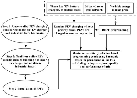 Figure 1. Schematic overview of the proposed nonlinear online plug-in electric vehicle (PEV) coordination approach considering harmonics.