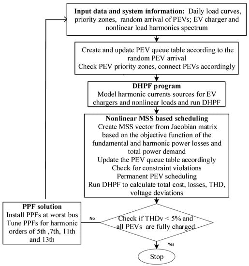 A new online PEV coordination algorithm has been developed that considers the current harmonic injections of the EV battery chargers and nonlinear loads. The recently implemented OL-MSSCA of [17] uses a Newton-Raphson based fundamental power flow in order to solve the objective functions of PEV coordination without considering current and voltage harmonics. In other words, [17] ignores the nonlinearities of the EV chargers and industrial loads. This paper modifies this approach by including the harmonic currents injected by EV battery chargers and nonlinear loads in the main program and proposes a nonlinear online maximum sensitivity selection-based charging algorithm (NOL-MSSCA) for the coordination of PEVs, which also considers battery charger and industry load nonlinearities. The NOL-MSSCA is an online program and performs PEV coordination at a 5-min interval over a 24-h period (Figure 2). To implement this approach, a DHPF program was performed to calculate the harmonic bus voltages, harmonic losses and THDv of the system. The sensitivity of the total system power losses to the power consumption of each PEV at each bus were calculated using the Jacobin matrix of the DHPF algorithm to form the MSS vector. As such, the created MSS vector was used for permanent scheduling of PEVs considering the maximum total demand of the system. The proposed algorithm in Figure 2 is based on the following ideas: