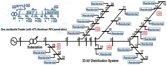 The developed NOL-MSSCA was used to investigate the impacts of battery chargers and nonlinear load harmonics on uncoordinated and coordinated PEV charging. The aim is to fully charge all vehicles by 0800h for the next day’s trip without exceeding the distribution transformer loading and the network power quality limits (Equation (9)). The algorithm was tested for the modified IEEE 449 bus system of Figure 3 that includes a 23 kV distribution network and 415 V residential feeders. The coordination algorithm is designed to control the node and network THDv levels within the permissible limits of 5% as recommended by the IEEE 519 Standard [18].