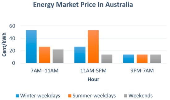 The modified 449 node smart grid system, including PEVs is considered to demonstrate the proposed NOL-MSSCA of Section 2.2 for different PEV penetrations. Figure 3 shows the system under study, including the PEVs and their EV charger harmonics. The main branch is the IEEE 31 bus 23 kV system [22], which includes 22 low voltage 19 bus 415 V residential feeders with different PEV penetration levels. System and load parameters are available in [17] and [22]. The daily residential load curves of [17] and the market energy price of [19] for summer weekdays have been used for the simulations in this paper (Figure 4). Figure 4 shows the new tariff for producing and generating energy in Australia in 2018 [19]. This tariff is chosen since the LV residential feeders’ data is obtained from a suburb in West Australia (WA). As indicated in this reference, the energy price changes may lead users to consume energy more efficiently. For example, the price of energy is more expensive during rush hours in summer (approximately 55 cents/kWh). Therefore, the aim is to push the PEV charging activities to a later time, so they are charged during off-peak hours. The proposed online approach (NOL-MSSCA) aims at considering both customer preference (based on priority zones) and the concerns of the utilities. In the objective function, the cost per MWh of generation (KG) is computed based on the latest market energy price of [19].