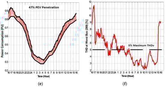 Figure 5. Simulation results for Case 1—Uncoordinated PEV charging considering harmonics including power consumption and THDv of (a,b) 16% PEV charging penetration; (c,d) 32% PEV charging penetration; (e,f) 47% PEV charging penetration.