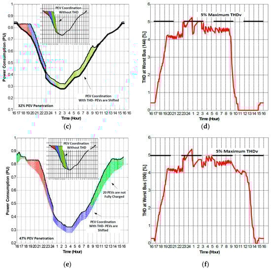 Figure 6. Simulation results for Case 2: NOL-MSSCA considering harmonics including power consumption and THDv of (a,b) 16% PEV charging penetration; (c,d) 32% PEV charging penetration; (e,f) 47% PEV charging penetration.